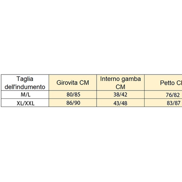 Taglia | Spalla (cm) | Lunghezza pantalone (cm) |