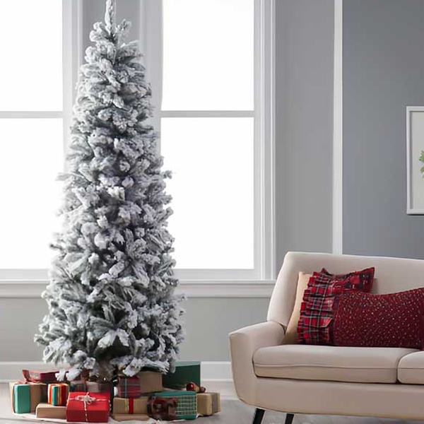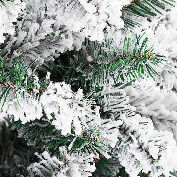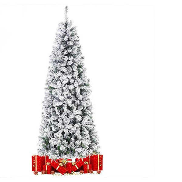 • Albero di Natale Slim in pvc floccato, effetto innevato molto realistico, floccatura di altissima qualità: la neve Non si stacca.