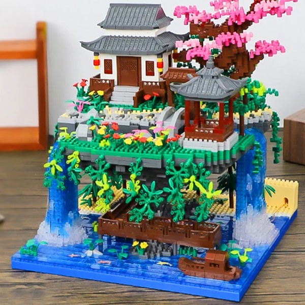 - Design cinese raffinato con padiglioni dettagliati, cascate e fiori di pesco in fiore