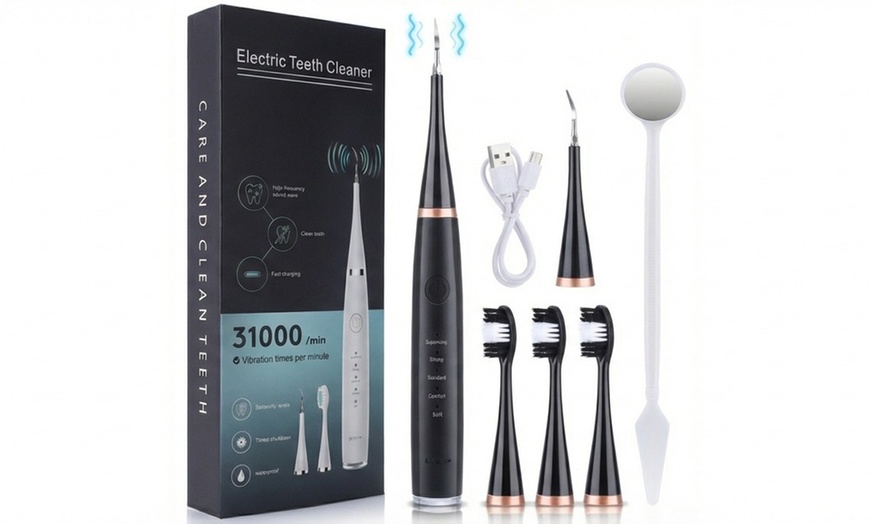 Pulisci a fondo i denti con questo dispositivo 2-in-1: pulitore elettrico per denti e spazzolino elettrico. Dotato di cinque modalità, resistente all’acqua IPX6, tre testine intercambiabili e ricarica USB!