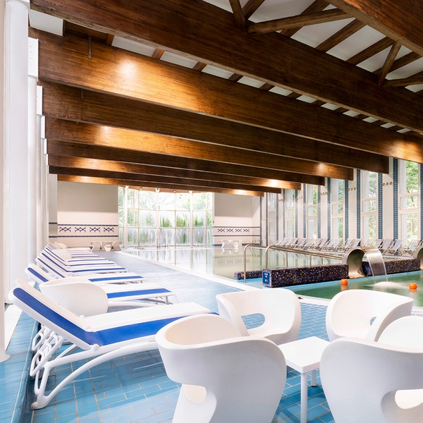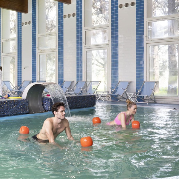 - Piscine Parco (285 mq). Area composta da due piscine: la più grande con acqua a 32° C, utilizzata per il nuoto libero anche controcorrente e dotata di hydrobike, cascate d’acqua e idromassaggi a due getti. La più piccola con acqua a 34° C con idromassaggi e geyser, ideale da alternare alle altre piscine a temperature più basse. Le Piscine Parco sono utilissime per drenare i liquidi, sciogliere la muscolatura e stimolare la circolazione. Consulta la Routine Drenante all’interno della piscina per scoprire il percorso completo da eseguire in completa autonomia.