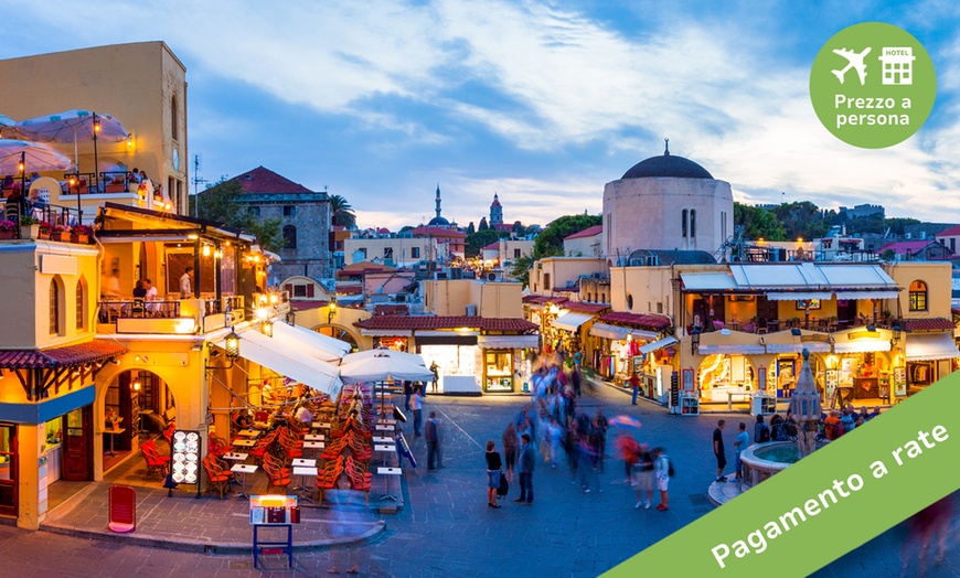 - Volo A/R diretto con partenza dagli aeroporti di Bari, Napoli, Milano, Roma, Pisa o Catania e destinazione Rodi