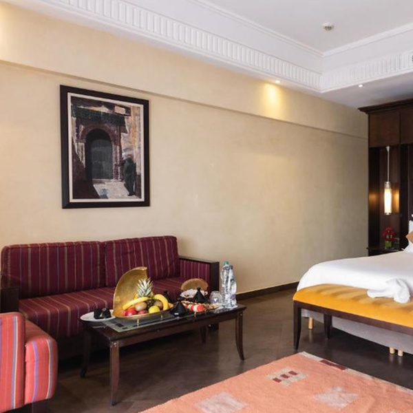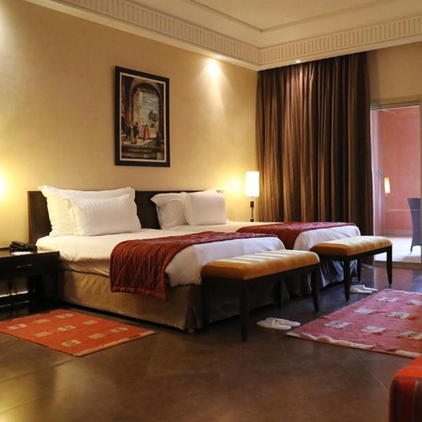 Le camere e le suite del resort sono tra le più spaziose di Marrakech, progettate per fondere l'architettura tradizionale marocchina con il lusso contemporaneo. Ogni sistemazione è arredata con materiali pregiati e tonalità calde, dotata di aria condizionata, TV satellitare, minibar, connessione Wi-Fi e ampi bagni in marmo. Tutte le camere dispongono di una veranda o balcone privato con vista sui giardini dell'Agdal, sulle montagne o sulla magnifica piscina centrale, garantendo un'atmosfera di totale privacy e comfort.