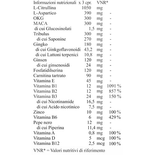 Ingredienti: L-Citrullina; Agente di carica: Cellulosa microcristallina; Acido L-Aspartico; Ornitina alfachetoglutarato (OKG); Maca (Lepidium Meyenii Walp.) radice e.s. titolato in glucosinolati 0,5%; Tribulus (Tribulus terrestris L.) pianta intera e.s. titolato in saponine 90%; Antiaggreganti: Mono e digliceridi degli acidi grassi, Magnesio stearato, Biossido di silice; Gingko (Ginkgo biloba L.) foglie e.s. titolato in ginkgoflavonoidi 24% e lattoni terpenici 6%; Ginseng (Panax Ginseng C.A. Mayer) radici e.s. titolato in ginsenosidi 20%; Fosfatidilserina; D-alfa-tocoferilacetato (Vitamina E); L-Carnitina tartrato; Zinco citrato; Piridossina (Vit. B6); Tiamina (Vitamina B1); Riboflavina (Vitamina B2); Nicotinamide (Vitamina B3); Pepe nero (piper nigrum) frutto e.s., titolato in piperina 95%; Acido nicotinico (Vitamina B3); Vitamina A acetato; Cianocobalamina (Vitamina B12); Colecalciferolo (Vitamina D3); Fibra di acacia