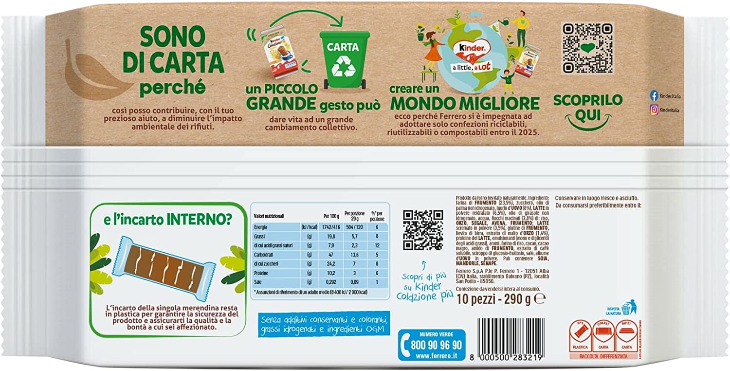 - Ingredienti: farina di frumento (23,5%), zucchero, olio di palma non idrogenato, tuorlo d'uovo (8%), latte in polvere reidratato (6,5%), olio di girasole non idrogenato, acqua, fiocchi macinati (3,8%) di: riso, orzo, segale, avena, frumento; latte scremato in polvere (3,5%), glutine di frumento, lievito di birra, estratto di malto d'orzo (1,4%), proteine del latte, emulsionanti (mono e digliceridi degli acidi grassi), aromi, farina di riso, cacao, cacao magro, amido di frumento, estratto di caffé, sciroppo di glucosio-fruttosio, sale