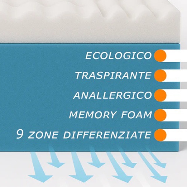 - Strato 1: Memory Foam alto 7 cm con tecnologia a 9 zone differenziate, si auto-modella in base al peso e al calore.
