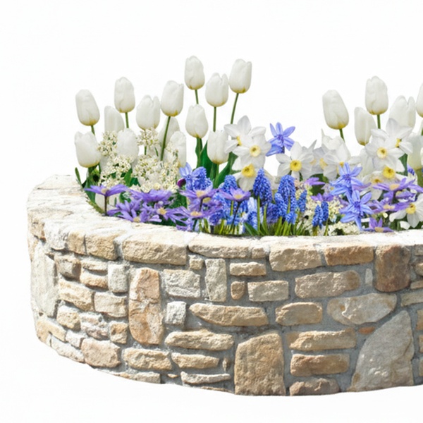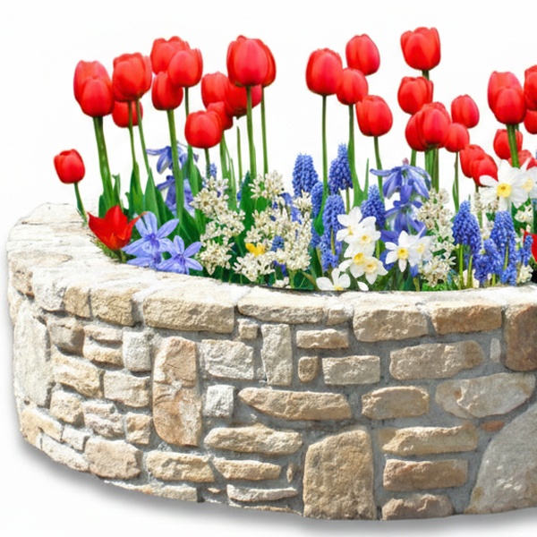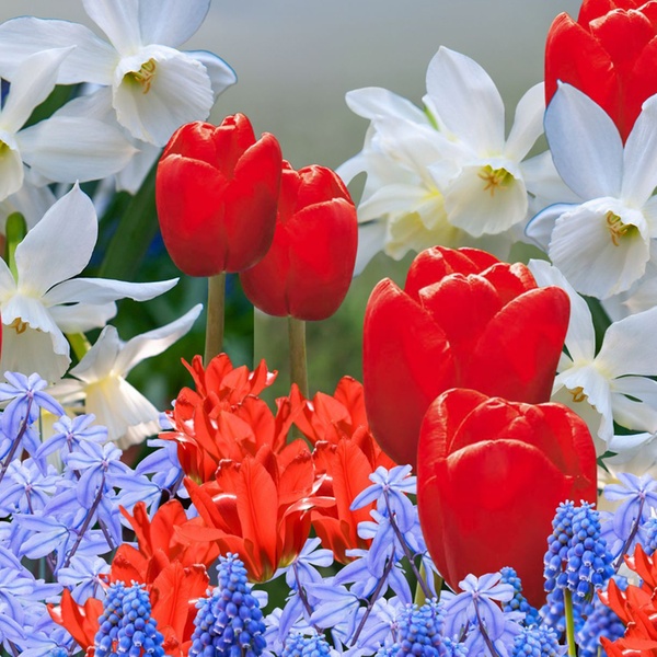- Include tulipani Triumph rossi, tulipani linifolia con fiori a stella, narcisi bianchi, scilla siberica blu, muscari armeniacum blu e allium neapolitanum bianco