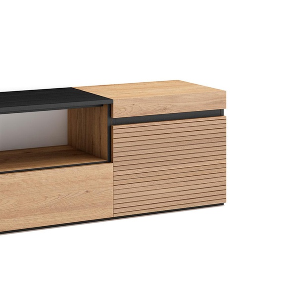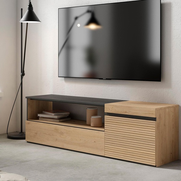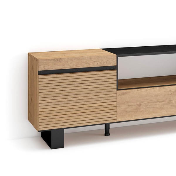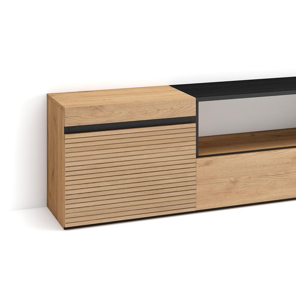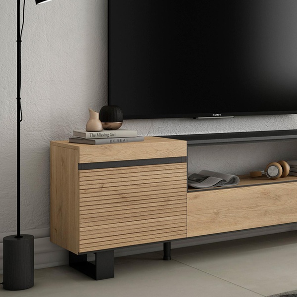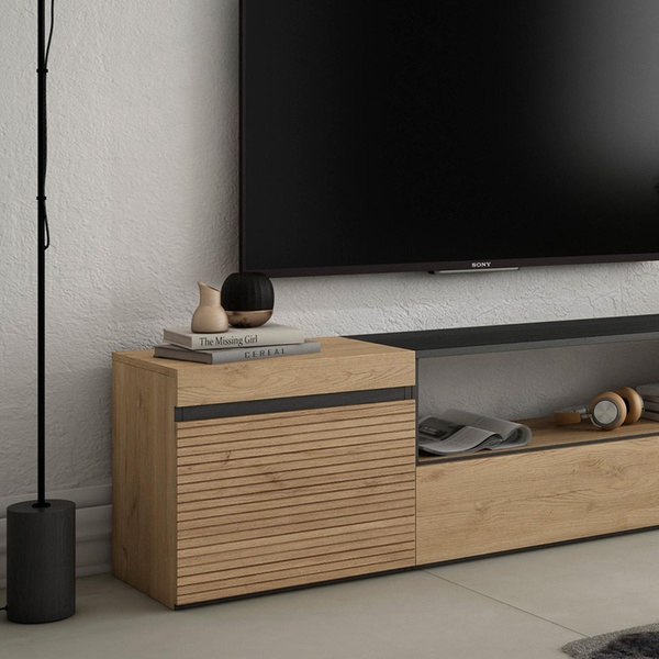 - Due moduli TV con anta e dettaglio a righe, ampia capacità di contenimento. Dimensioni di ogni modulo: 51 cm larghezza, 45 cm altezza, 35 cm profondità.