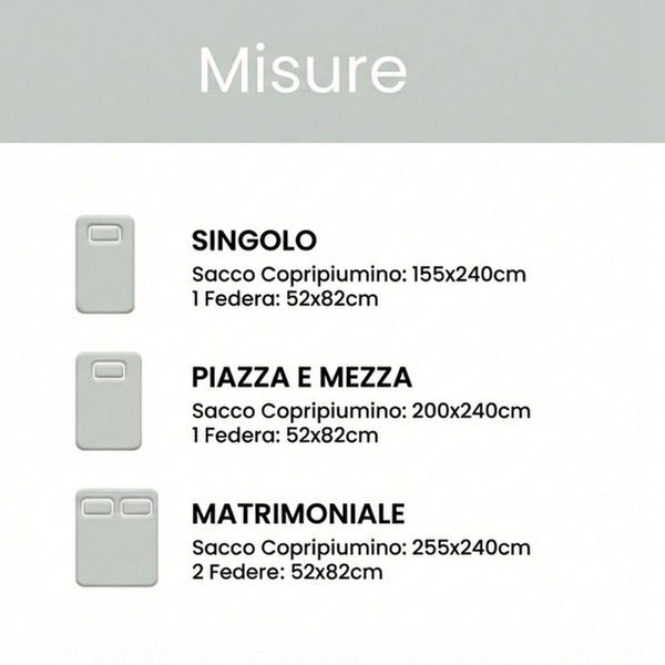 - Singolo: Sacco 155x240 cm + 1 federa 52x82 cm