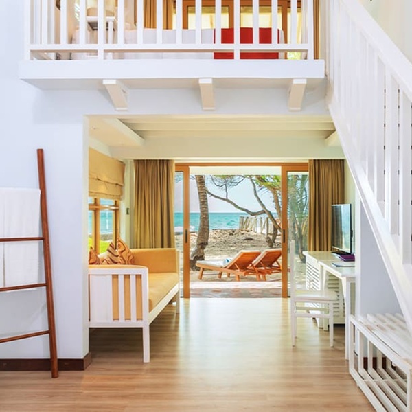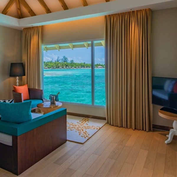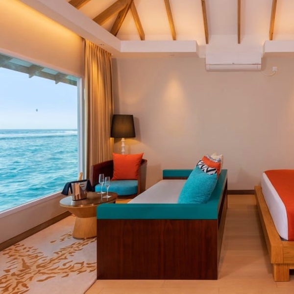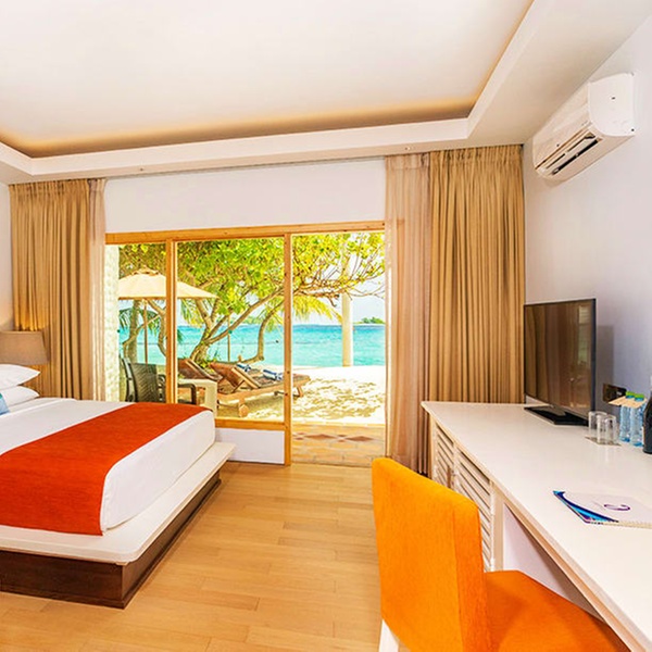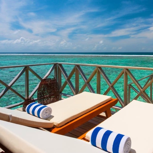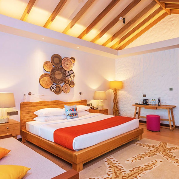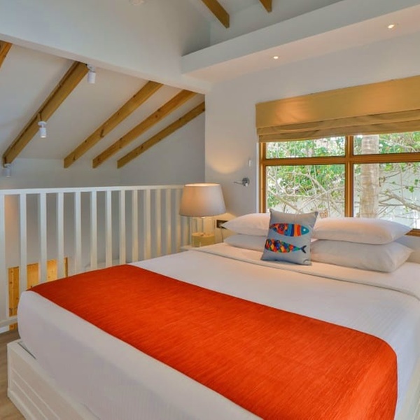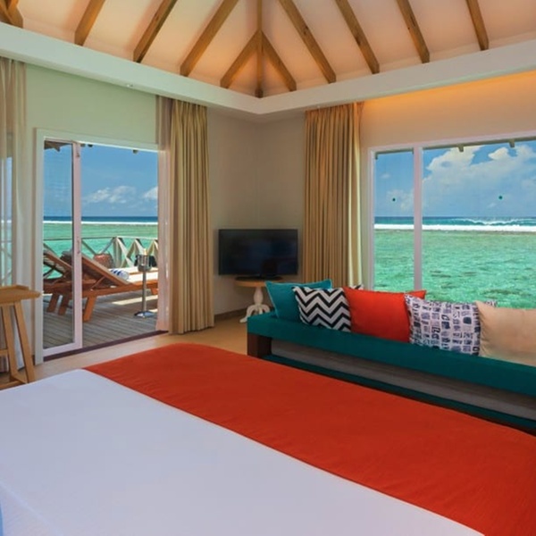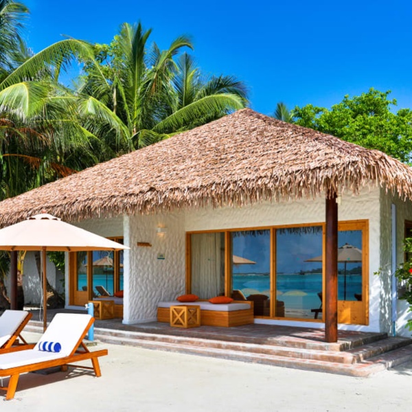 Abbandonati al fascino di questo bungalow sulla spiaggia, dai toni immacolati e i dettagli in bambù. Ogni giorno, proverai sensazioni uniche grazie alla vista panoramica dell'oceano dal letto king size o alla rinfrescante doccia esterna dopo un bagno in laguna.