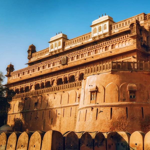 La mattina, visita al forte di Junagarh costruito tra il 1588 e il 1593 dal raja Rai Singh, generale dell'esercito di Akbar, imperatore dei Moghul. Il forte è circondato da mura lunghe 986 metri, dotate di 37 bastioni, con la Surajpol (o Porta del sole) che rappresenta l'ingresso principale del complesso. Le strutture all'interno di queste mura si concentrano sul lato sud e creano un insieme pittoresco di cortili, balconi, chioschi, torri e finestre. Una delle caratteristiche principali del forte è la bellezza delle sculture in pietra che decorano alcuni dei palazzi più sontuosi.