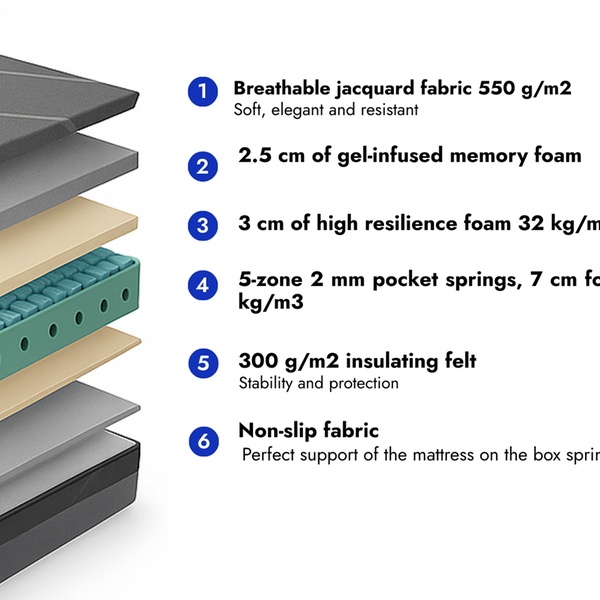 - Memory Foam al GEL (2,5 cm – densità 40 kg/m³): si adatta alle forme del corpo, allevia i punti di pressione (schiena, spalle, fianchi), riduce i micro-risvegli. Ideale per chi soffre di dolori lombari o articolari.