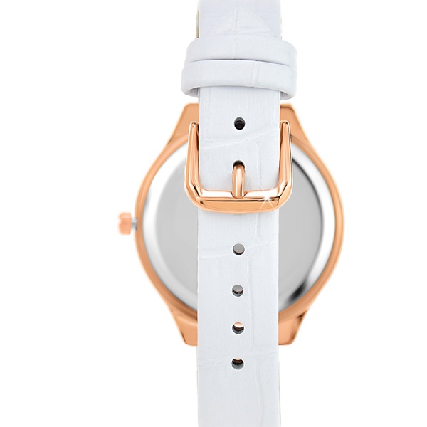 - Cinturino: pelle bianca, lunghezza 17–21 cm, larghezza 14 mm