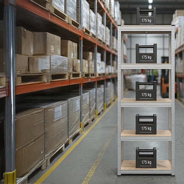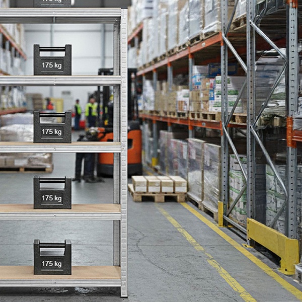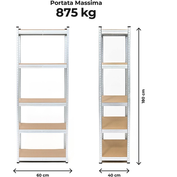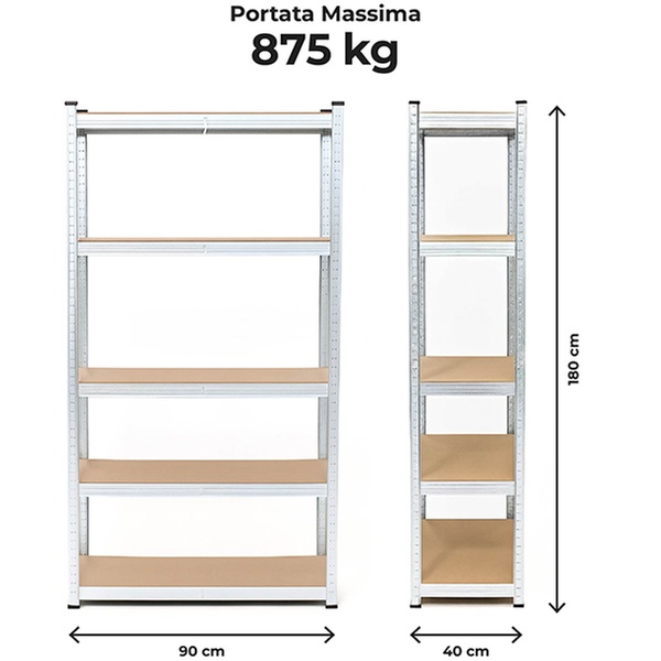 - Alta capacità di carico: ogni ripiano, dotato di pannelli in MDF ecologico, può sostenere fino a 175 kg, per una portata complessiva di 875 kg. Un’ottima soluzione per chi cerca robustezza e ampio spazio di stoccaggio.