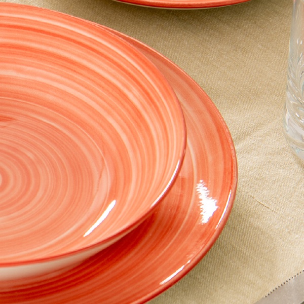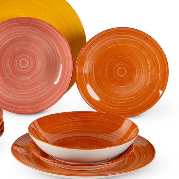 • Linea ''Fuoco'' con decoro a spirale in tre tonalità calde Rust, Sunset e Mango che spaziano dall'arancio al rosa cipria fino al giallo solare. Una palette luminosa e accogliente per una tavola energica e conviviale, perfetta per valorizzare ogni occasione.