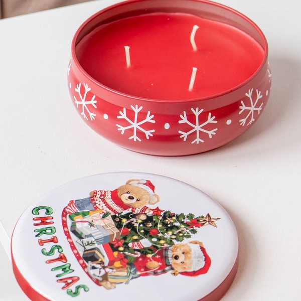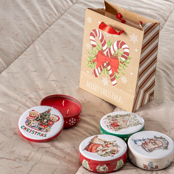 Quattro eleganti candele profumate in barattoli decorati, perfette per illuminare le feste con profumi caldi e avvolgenti.