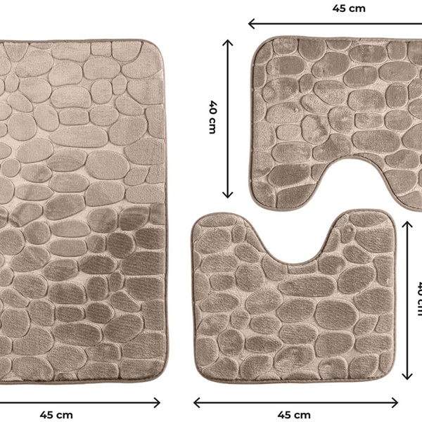 Il set comprende: 1 tappeto rettangolare: 45 x 75 cm e 2 tappeti sagomati: 45 x 40 cm
