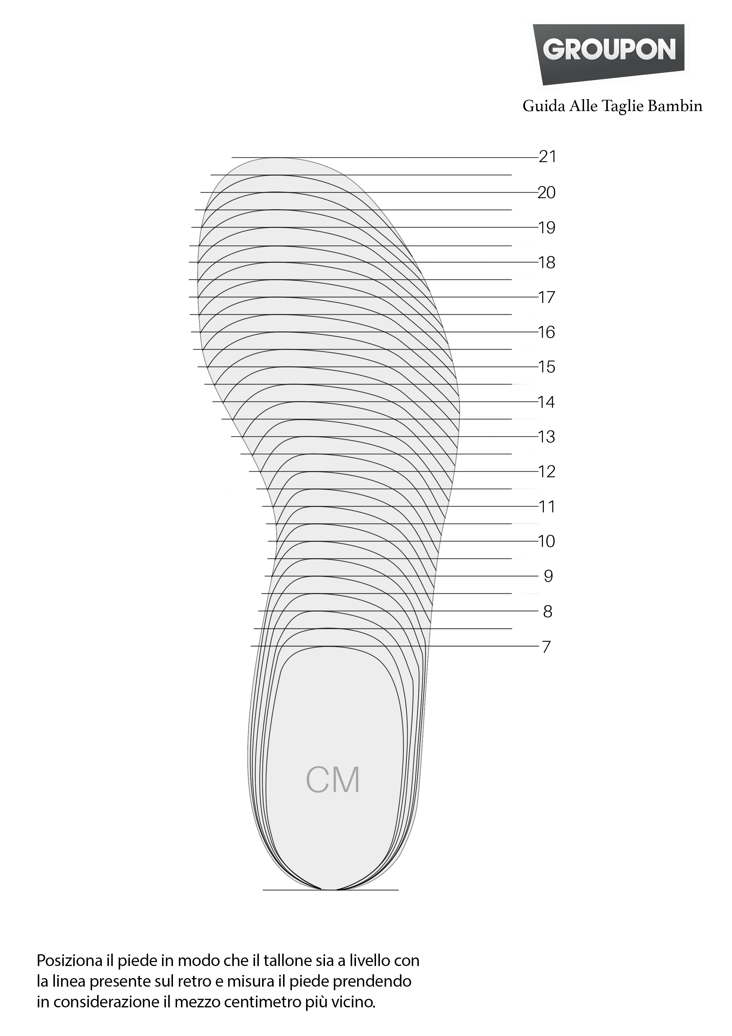 I bambini crescono in fretta, e i loro piedi possono cambiare taglia ogni 4-5 mesi. Utilizza un righello per capire quale sia la giusta taglia. Se il piede misura un numero a metà tra due taglie, consigliamo di acquistare quella più grande. Inoltre le scarpe per bambini non andrebbero indossate se sono troppo strette; la misura ideale deve permettere di inserire un dito nello spazio tra il tallone e la scarpa.