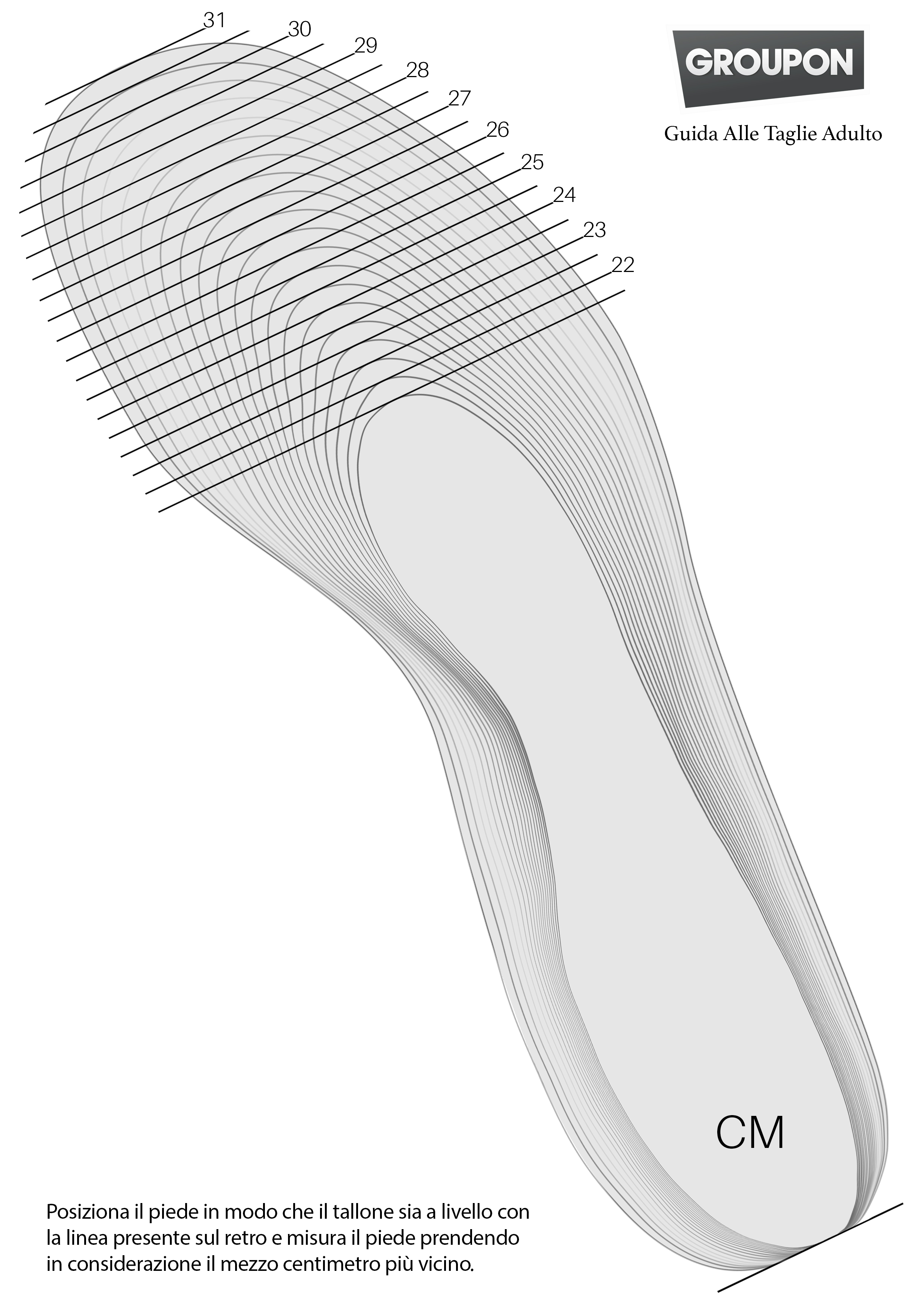 Ogni scarpa è diversa e Groupon lo sa, per questo ci sforziamo di assicurare le migliori informazioni necessarie prima di effettuare l'acquisto. Sulla maggior parte dei deal di scarpe mostreremo le calzature con taglie in formato UK ed EU e forniremo la misura corrispondente in centimetri. Raccomandiamo fortemente di leggere la guida alle taglie per identificare il numero che calzi nel modo migliore prima di effetture l'acquisto.